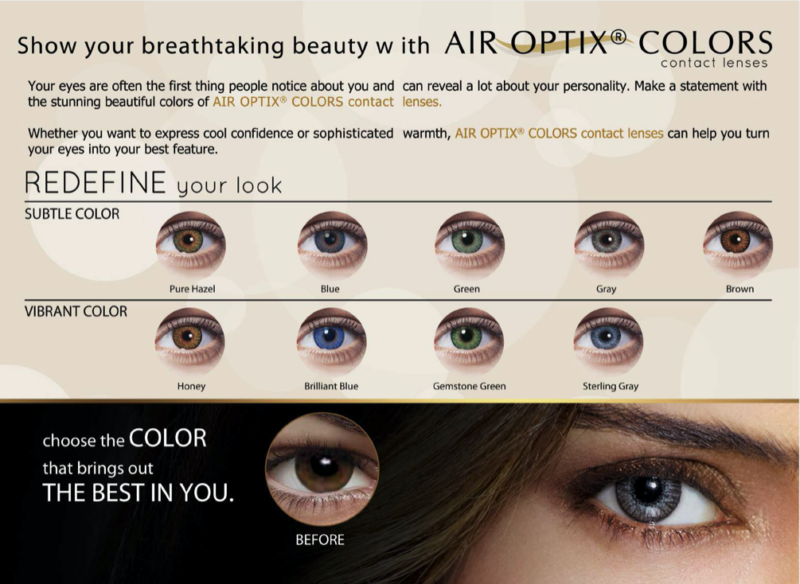 AIR OPTIX COLORS are color contact lenses designed to enhance or transform dark or light eyes, with a natural effect, and can be prescribed with or without vision correction. they are made with exclusive SmartShield Technology and feature the 3-in-1 Color Technology to blend naturally with the color of your eye, so you can experience a new look that can be subtle or vibrant.