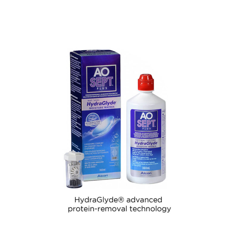 AOsept Plus HydraGlyde works to both effectively deep clean and hydrate contact lenses. AOsept Plus HydraGlyde’s advanced protein-removal technology ensures that your contact lenses will receive a thorough cleanse, whilst still maintaining a high level of moisture.